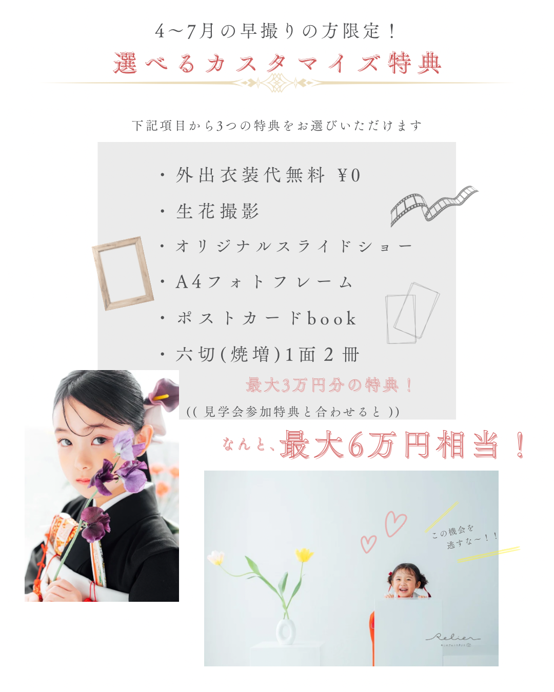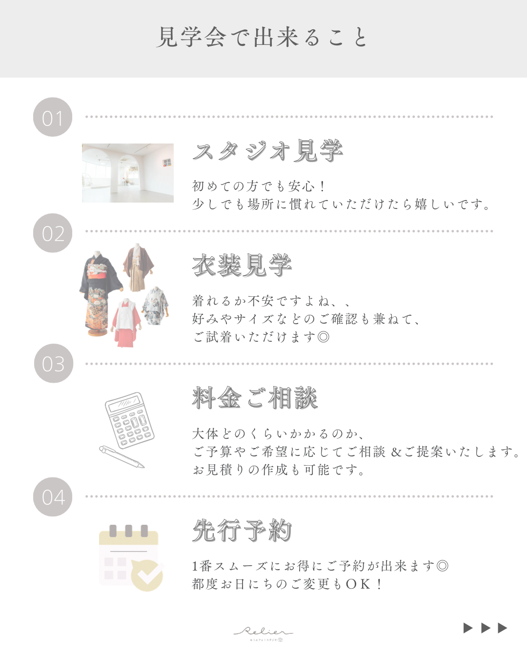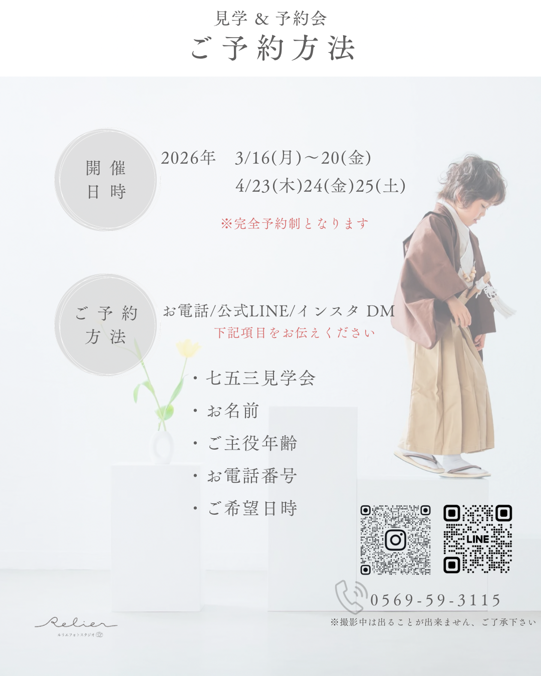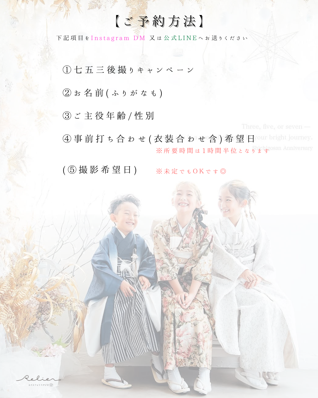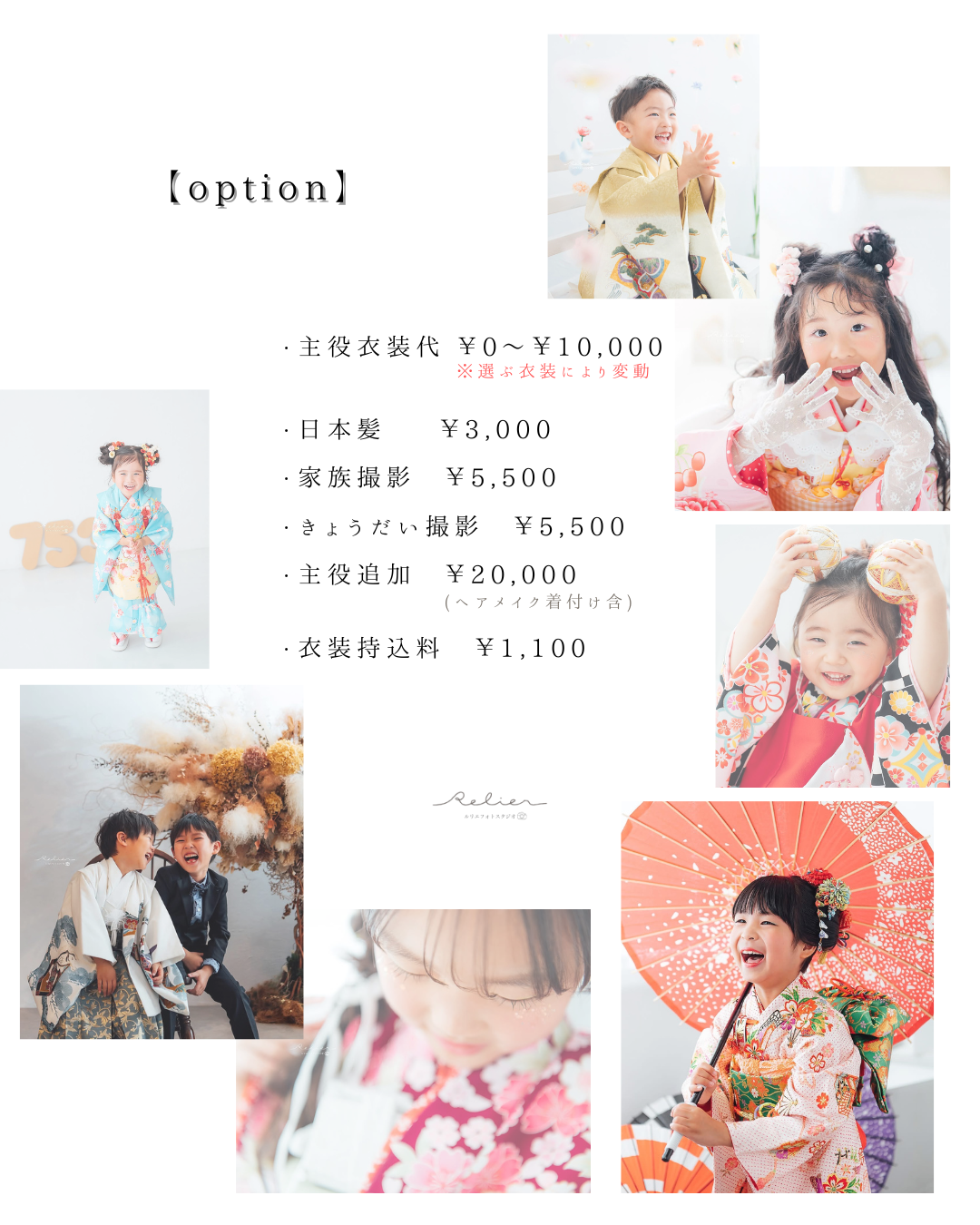 753 7歳5歳3歳それぞれの成長をお祝いする行事ここまで育ってくれてありがとうこれからもアナタらしく PriceQ&AGalleryCostume * Campaign * Price Q 見学だけでも可能ですか? A 可能です。お衣裳やプラン、撮影時期のご相談も承っております。 Q 着物の持込はできますか? A 可能です。1着につき別途持込料1,100円がかかります。 Q 歯が抜けてしまったのですが... A 修整でお直しが可能です(別途料金)。その時ならではということで、そのままの方もいらっしゃいます。 Q ケータイ等で撮影しても大丈夫ですか? A はい、大丈夫です。カメラマンの撮影に差し支えない範囲でしたら撮影中も可能です。(目線等ずれてしまうことがありますと、ご遠慮いただく場合もございます) Q 祖父母が見にきても大丈夫ですか? A はい、ぜひお越しください。別途撮影料で一緒に撮影も可能です。 ☆人見知りやご機嫌ななめなどで撮影ができない場合は無償で別日の再撮影をご提案します☆他にもご不安な点などございましたらメール・LINE・Instagramよりご連絡ください 衣装はこちら Photo menu Birthday / Half birthday 753 20th Wedding Maternity / New Born Anniversary ルリエフォトスタジオ 愛知県半田市青山1丁目3-5 青山石川ビル3階 TEL. 0569-59-3115 営業時間 / 9:00~18:00 定休日 / 水曜日(木曜日不定休) Home Campaign Photo menu FLow Staff Access Reserve / Contact Instagram Facebook HOME > 撮影メニュー > 七五三 画像や文章の無断転載・複製を禁じます ©2024- Relier photo studio. Designed by ANOMALY DESIGN.