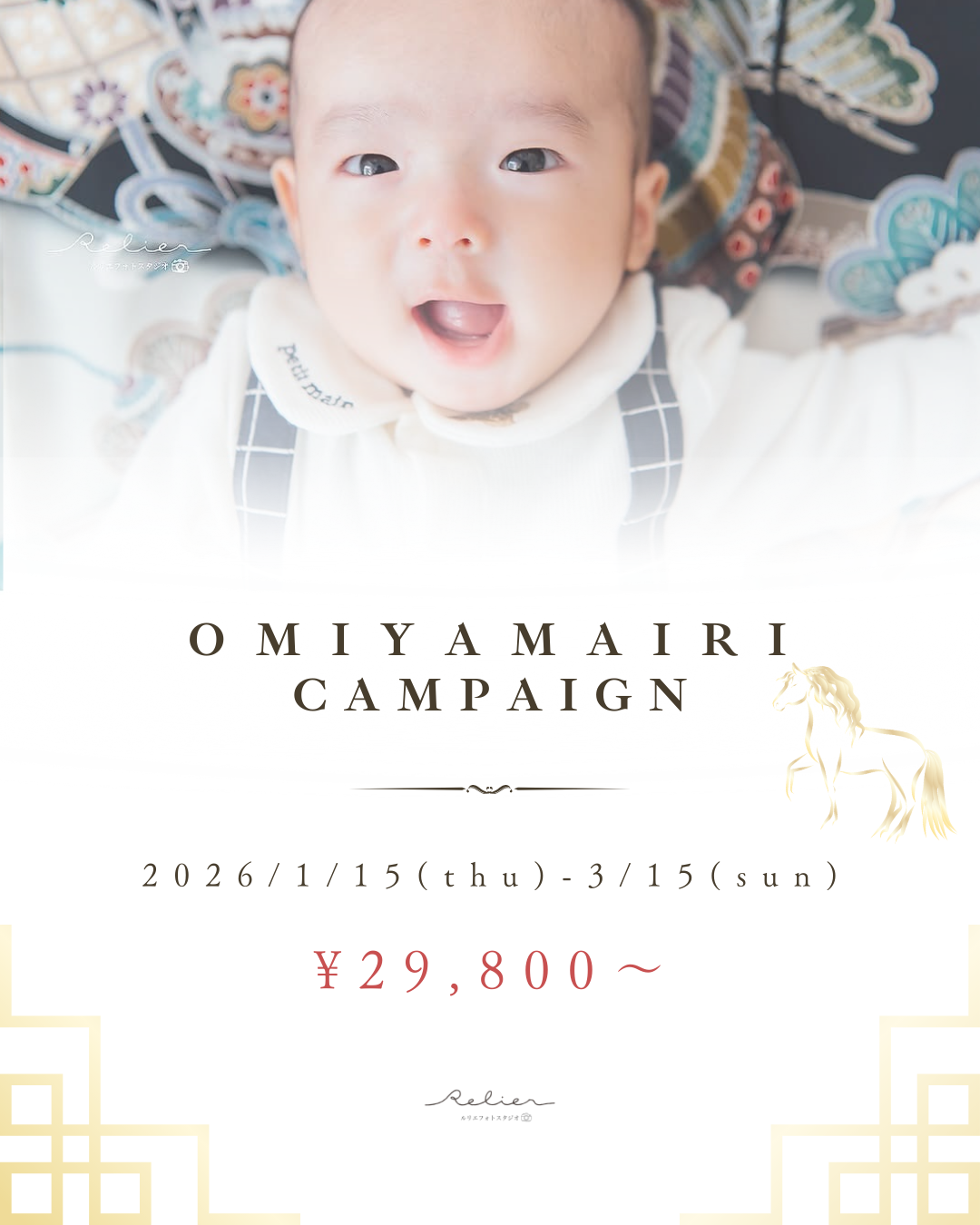 Anniversary 家族の歴史や想いを未来へ繋げていけますようになにげない日常がタカラモノ お宮参り / 入園入学 / 卒園卒業 / 記念撮影 etc... PriceQ&AGalleryCostume * Campaign * Price Q 体調を崩してしまった場合どうなりますか? A 撮影日の変更が可能です。その場合の追加料金はございません。 Q お宮参りで神社に出張で来てもらうことは出来ますか? A 可能です。ロケーション5,500円と場所により出張費が追加となります。また、事前に必ずご希望される神社にて撮影許可のご確認をお願いいたします。 Q わんちゃん(ペット)との撮影は可能ですか? A もちろん可能です。撮影料5,500円が追加となります。可能であれば、ゲージ、リード等お持ちください。 Q ケータイや自分のカメラでも撮ってもいいですか? A 可能です。カメラマンの撮影に差し支えない範囲でしたら、撮影中や動画とかもぜひお撮りください。(光や目線などの関係でご遠慮いただくタイミングはお声かけいたします) ☆他にもご不安な点などございましたらメール・LINE・Instagramよりご連絡ください 衣装はこちら Photo menu Birthday / Half birthday 753 20th Wedding Maternity / New Born Anniversary ルリエフォトスタジオ 愛知県半田市青山1丁目3-5 青山石川ビル3階 TEL. 0569-59-3115 営業時間 / 9:00~18:00 定休日 / 水曜日(木曜日不定休) Home Campaign Photo menu FLow Staff Access Reserve / Contact Instagram Facebook HOME > 撮影メニュー > アニバーサリー・記念写真 画像や文章の無断転載・複製を禁じます ©2024- Relier photo studio. Designed by ANOMALY DESIGN.